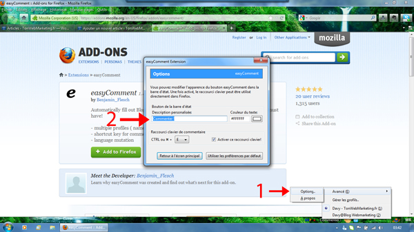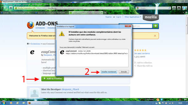 Rendez vous sur la page : https://addons.mozilla.org/en-US/firefox/addon/easycomment/ et cliquez sur « Add To Firefox ». Installez le plugin, et redémarrez votre navigateur pour finaliser l’installation.