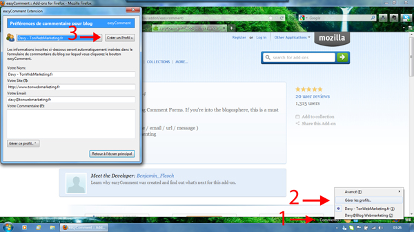 Le plugin est maintenant installé et activé (Si il n’est pas activé automatiquement, rendez-vous dans « Outils / Modules Complémentaires », puis activez le plugin « EasyComment »). Ensuite, cliquez sur le plugin, qui doit désormais être dans votre barre d’état, en bas de votre navigateur. Clique-droit / Gérer les profils.
