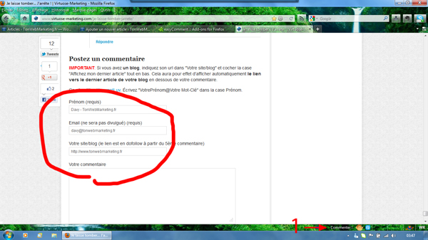 Rendez-vous sur l’un de vos blogs favoris, comme par exemple l’excellent Virtuose Marketing de Cédric Vimeux, puis après avoir lu l’article concerné, cliquez sur « Commenter ! » (Qui est en fait le texte que vous avez défini dans l’étape 3) ou utilisez le raccourci clavier que vous avez choisi.